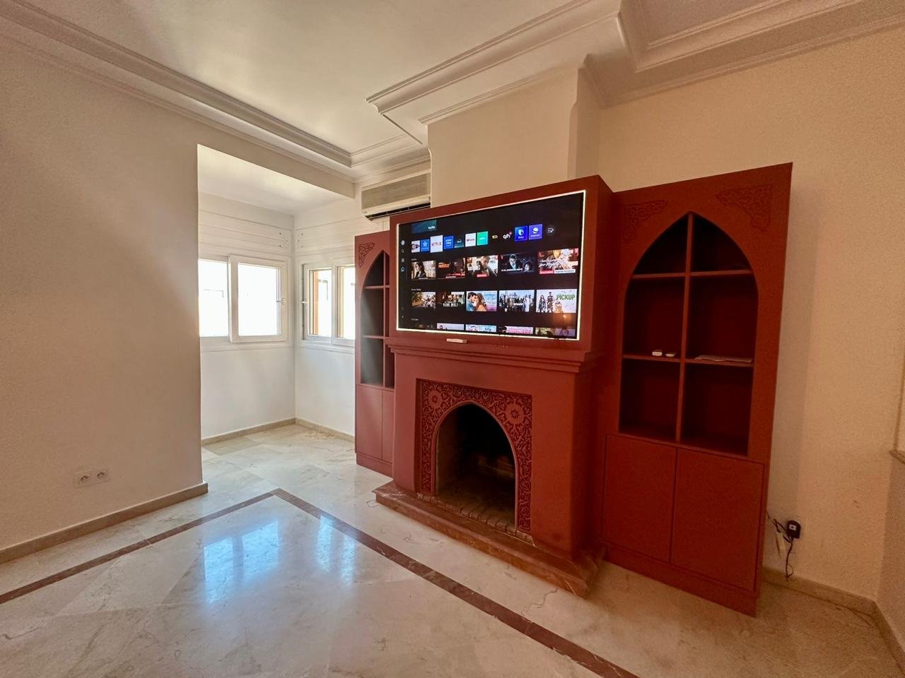 • Un vaste salon lumineux avec cheminée, parfait pour vos moments de détente, meuble tv fait sur mesure , assise canapé avec rangement